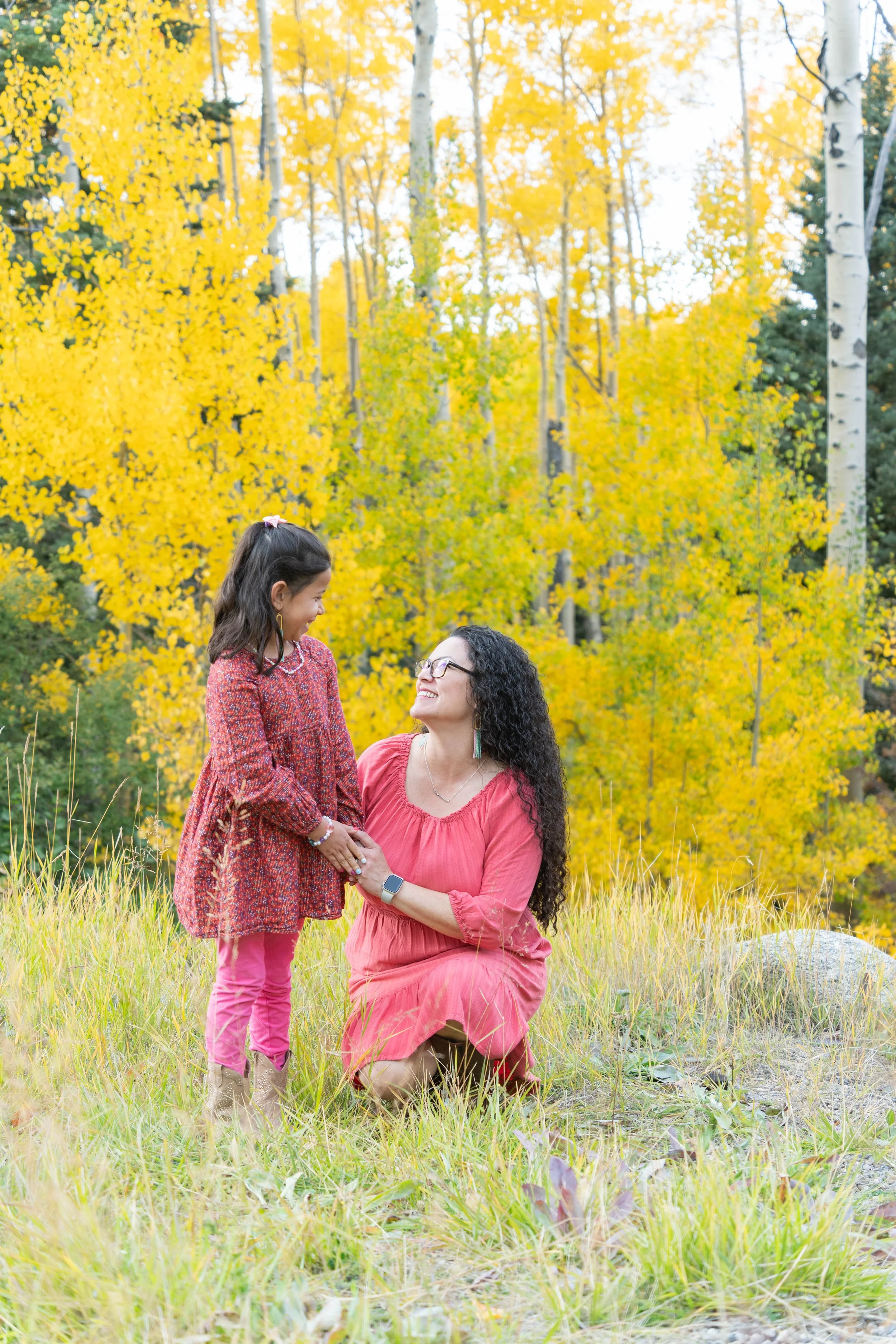 A woman with long brown hair smiling, carrying a young girl on her shoulders, who is wearing a large sun hat and a red dress, in a park with trees and sunlight.