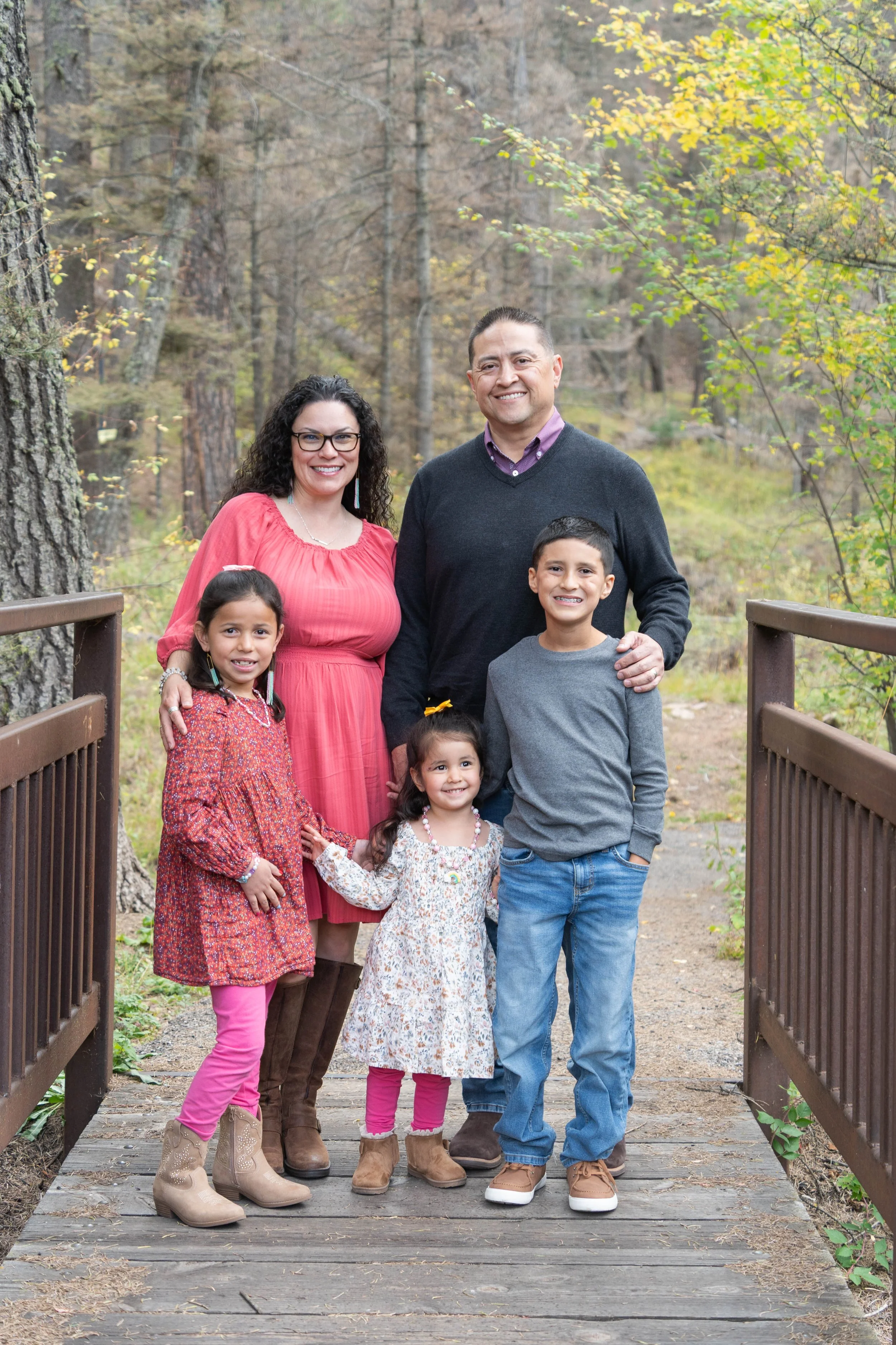 A family of three and a dog standing on a wooden bridge in a forest, smiling at the camera in autumn.