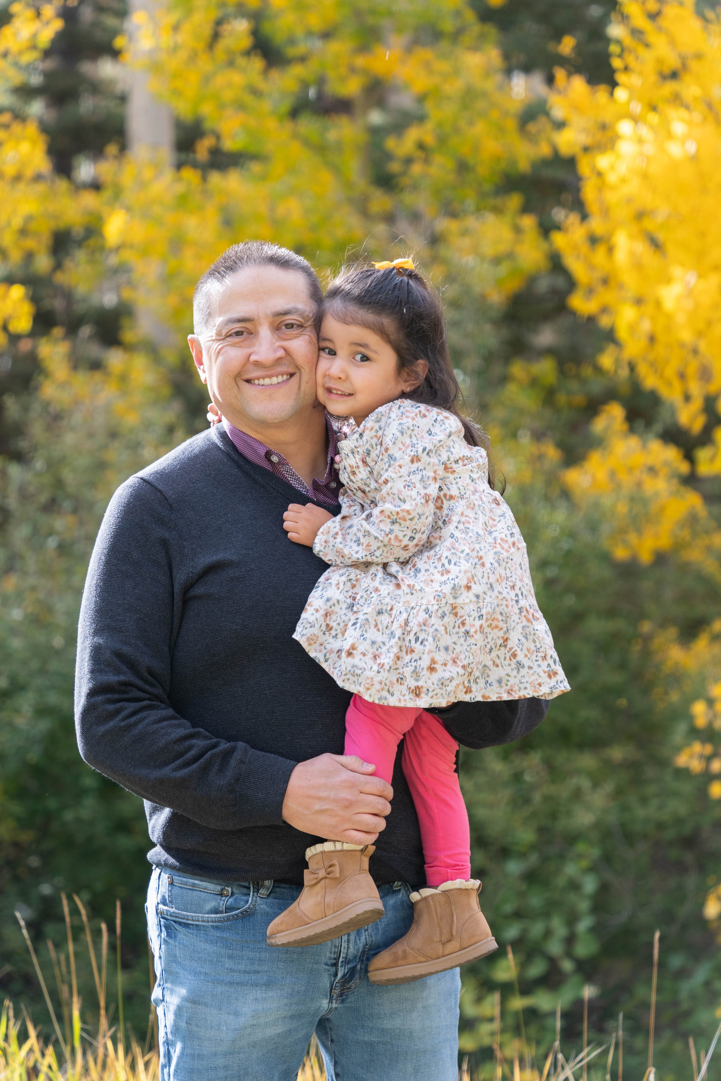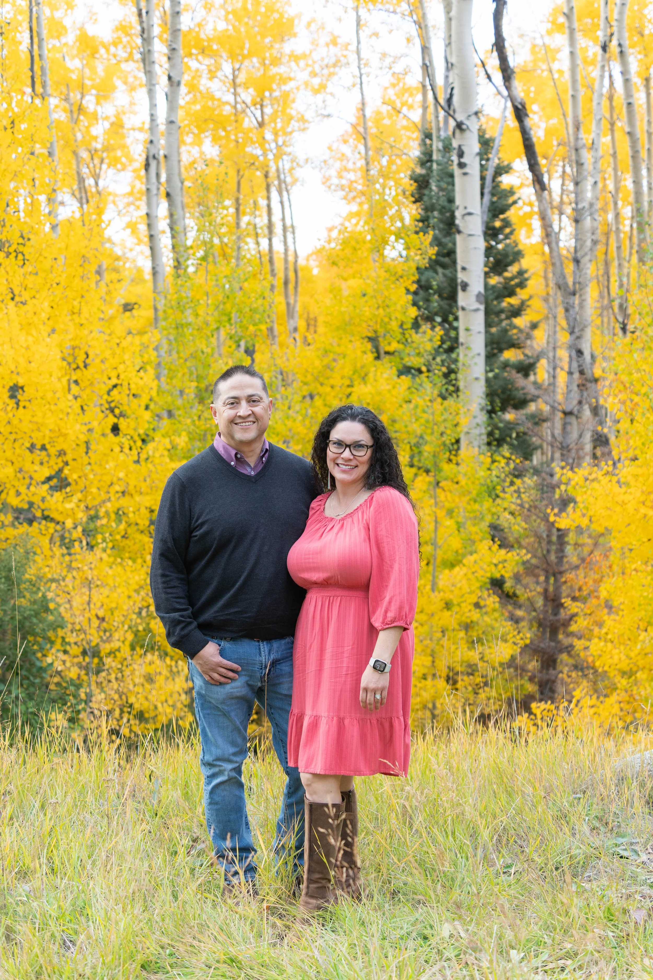 A family of three standing outdoors near a wooden fence, smiling at the camera, with green trees and hills in the background.